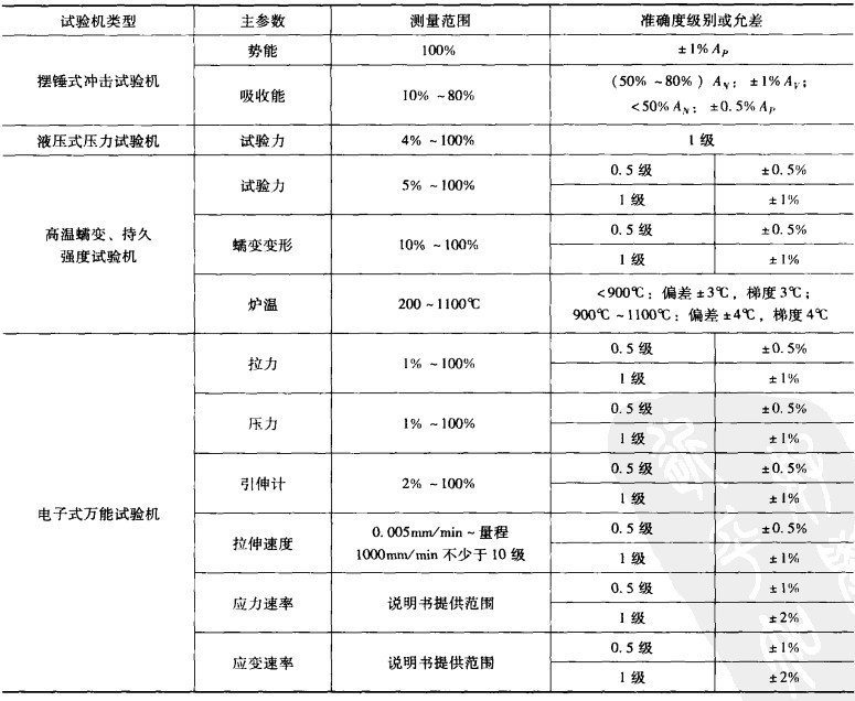上述試驗(yàn)力規(guī)格、量程范圍的確定方法對其他類型或者測量項(xiàng)目的指標(biāo)選擇具有普遍指導(dǎo)意義。同樣,了解不同試驗(yàn)機(jī)各項(xiàng)技術(shù)指標(biāo)的測量范圍對用戶來說是非常有幫助的。我們一擺錘式?jīng)_擊試驗(yàn)機(jī),液壓式拉力試驗(yàn)機(jī)、高溫蠕變、持久強(qiáng)度試驗(yàn)機(jī)和電子式萬能試驗(yàn)機(jī)為例,通過下圖看出不同類的試驗(yàn)機(jī)具有不同技術(shù)指標(biāo),每項(xiàng)技術(shù)指標(biāo)都有相應(yīng)測量范圍及誤差限或擴(kuò)展不確定度。