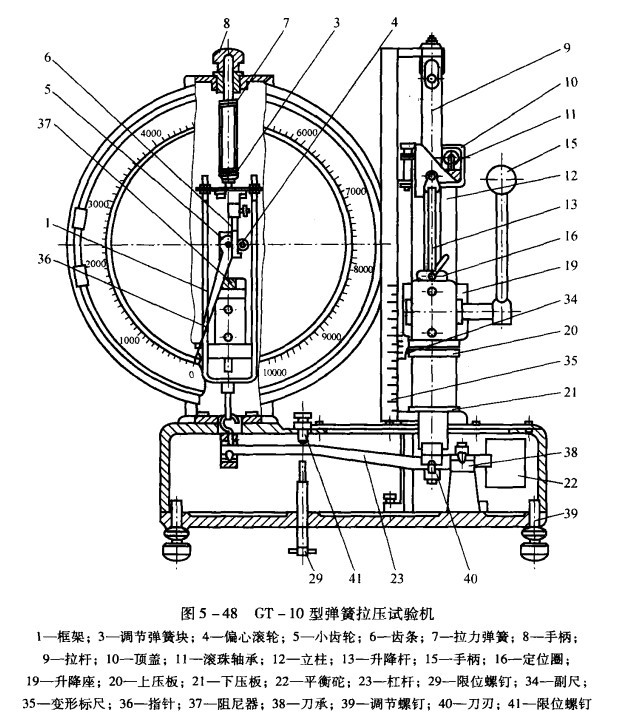機械式彈簧拉壓試驗機的操作程序與方法 1)轉動手柄32使指示牌31表示出所需負荷(GT-100、200機型),調整度盤零點,需注意調整零點應加上外加夾具及試樣的重量。2)按試驗彈簧的自由長度,搖動手柄18使升降座19調至相應位置,用小手柄17將其固緊在立柱12上。3)將彈簧放在下壓板21上(或掛在上拉鉤上),轉動手柄8,使指針對準度盤零點。4)如成批試驗時,可按彈簧在壓力或拉力下的變形量,將定位圈16固定在升降尺桿13上,若需對同一彈簧測量多點負荷時、可將定位桿14按不同負荷下的變形量固定好。5)將彈簧放正(或將彈簧掛上),轉動手柄15加上負荷,讀取相應的負荷或變形。6)緩慢卸除負荷