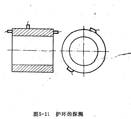 環(huán)形鍛件(如發(fā)電機護環(huán))中的缺陷具有各種方向,探測時,應由不通過方向分別用直探頭和斜探頭進行。用直探頭在護環(huán)的外圓表面進行周向探測,以發(fā)現(xiàn)護環(huán)內大部分缺陷,必要時,還應在端面進行探測。為發(fā)現(xiàn)裂紋,可用斜探頭(30°,40°)從護環(huán)外圓表面作周向和軸向探測,如下圖所示,使用過的護環(huán),主要用斜探頭探測其內外表面的裂紋,對通風孔邊緣的裂紋尚可用表面波探測。