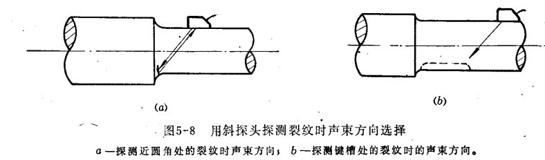 曲軸的探測 曲軸的探測以直探頭為主,一般在主軸頸、曲柄銷及扇板上進行。必要時,可用斜探頭做輔助探測,如下圖1,用斜探頭探測近軸頸過度區(qū)圓角處或軸鍵槽處的裂紋時,應注意選擇聲束的入射方向,如圖2。探測時還應注意油孔反射波與缺陷波的區(qū)別。
