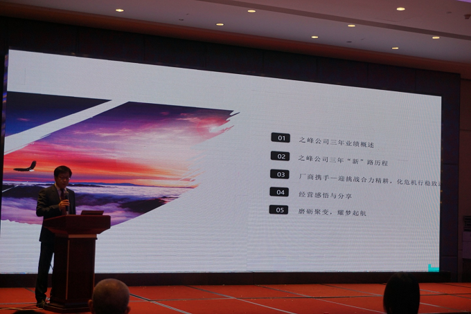 9點鐘大會正式開始,馬海龍總裁發(fā)表“合力謀發(fā)展,共贏創(chuàng)未來”的主題演講,講述著時代之峰公司不畏艱辛,勇登新高峰的篇章;介紹著三年的“新”路歷程,堅定不移的走不斷創(chuàng)新之路;堅持廠商攜手——迎挑戰(zhàn)合力勤耕,化危機(jī)行穩(wěn)致遠(yuǎn)的故事;述說著經(jīng)營感悟與分享,與經(jīng)銷商朋友分析經(jīng)營的感悟與經(jīng)驗;展望著磨礪聚焦,筑夢起航五個篇章。演講過程中大家紛紛額首,掌聲不斷。